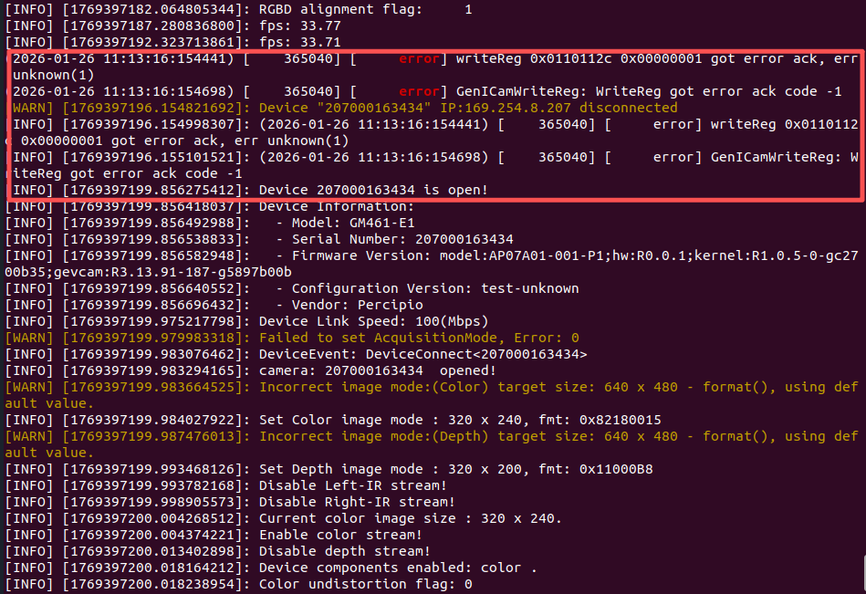 d. Return to Terminal 2, observe the output information. If the camera successfully resets and begins acquiring images again, it indicates the reset operation is complete.