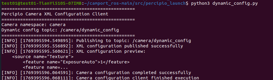 Use Percipio Viewer software to save parameter settings to the camera’s Storage area. ROS will automatically load the parameter configuration from the Storage area upon startup and begin image acquisition.