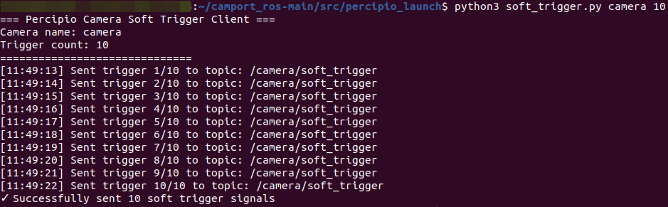 c. Open Terminal 2, navigate to the “src/percipio_launch” path, enter python3soft_trigger.pycamera10 and run it to send 10 software trigger commands to the camera.