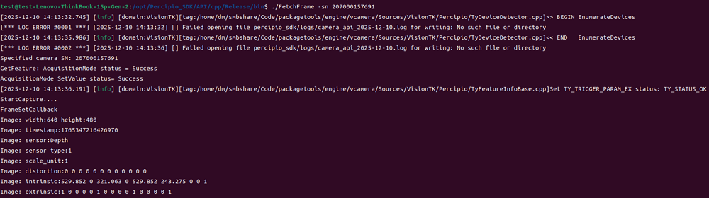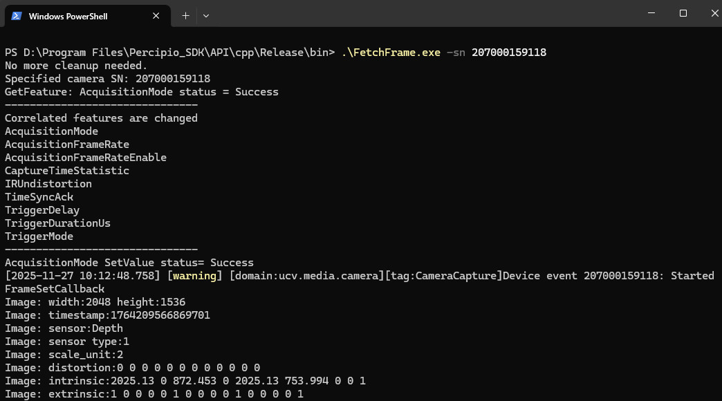 For example, to run a Release version demo, navigate to {Vcamera SDK Installation Directory}\Percipio_SDK\API\cpp\Release, open a terminal, and execute the program.
