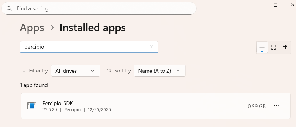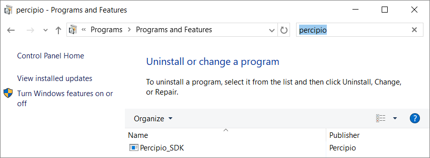 Method 2: Open Control Panel > Programs > Programs and Features, search for “percipio”, find “Percipio_SDK”, and uninstall it.