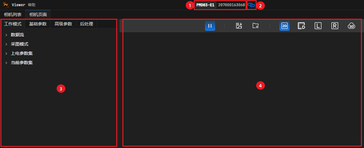 以一台同时包含彩色、深度、左图、右图组件的相机(如 PMD03-E1)为例,当数据流全部开启时,图像采集区 显示如下图所示。