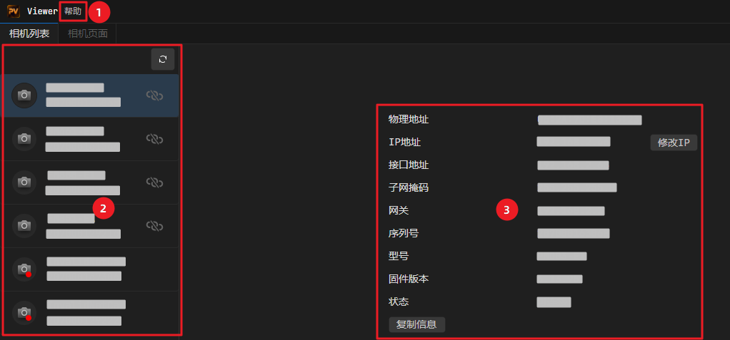 点击相机列表中任意一行,界面右侧的相机信息区将显示该相机的详细信息。