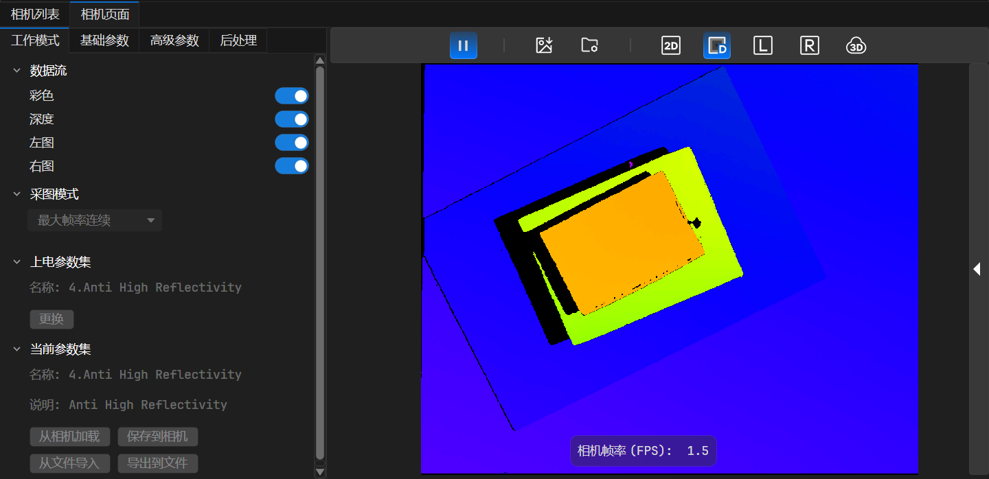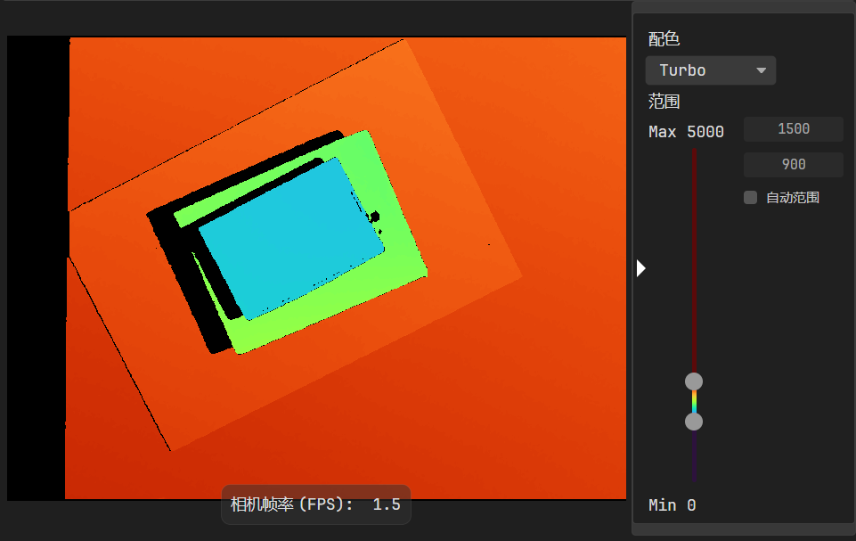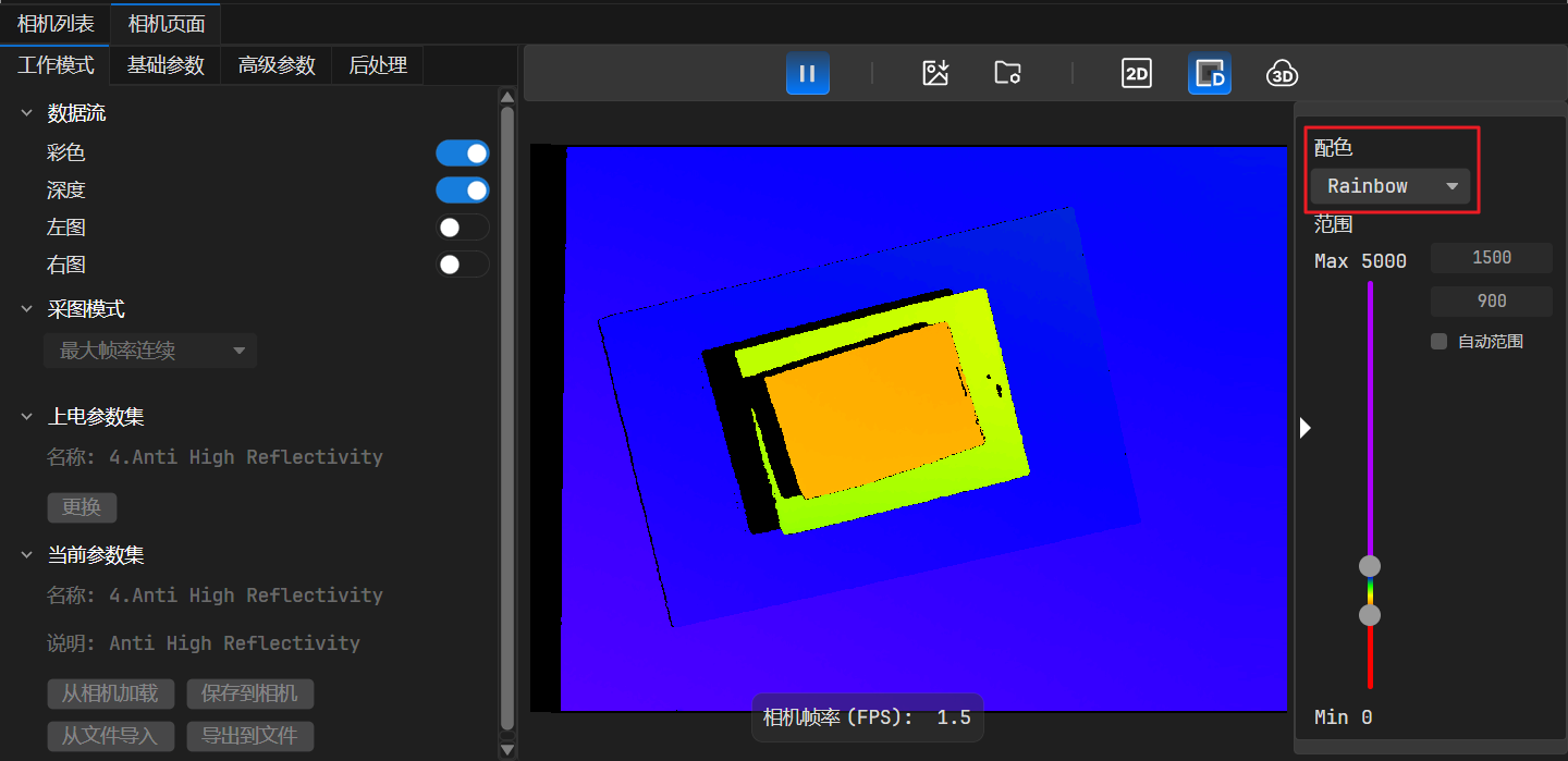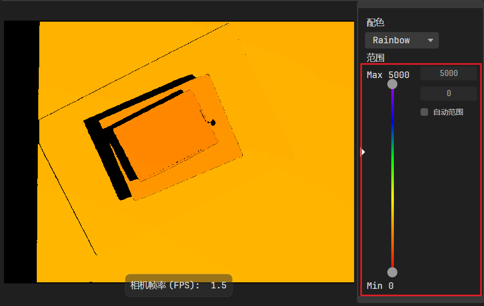 深度图支持动态渲染范围调整,开启深度图显示时,可点击图像采集区右侧的