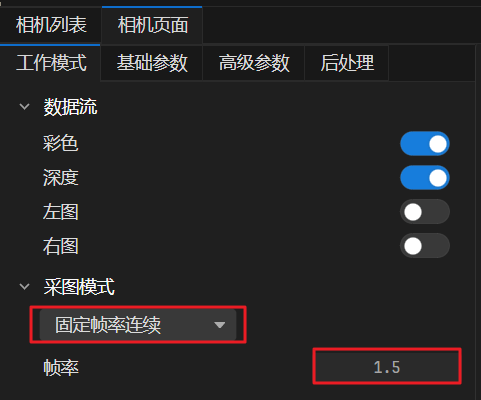 在该模式下,软件将以设定帧率连续输出已使能的数据流。设置的固定帧率不能超过相机处理能力,即“最大帧率连续”采图模式下相机的出图帧率。