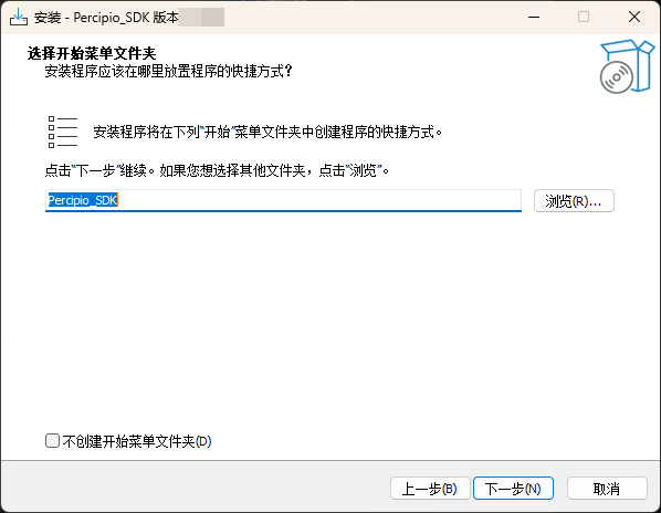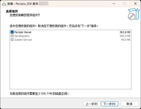 选择待安装的组件。如不要安装 Percipio Viewer(基于 Vcamera SDK 开发的图形用户界面 GUI),请取消勾选 “Percipio Viewer”。