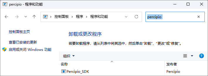 方式2:进入(Windows系统)控制面板 > 程序 > 程序和功能,搜索 “percipio”,找到 “Percipio_SDK” 并卸载。